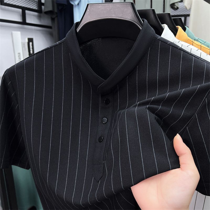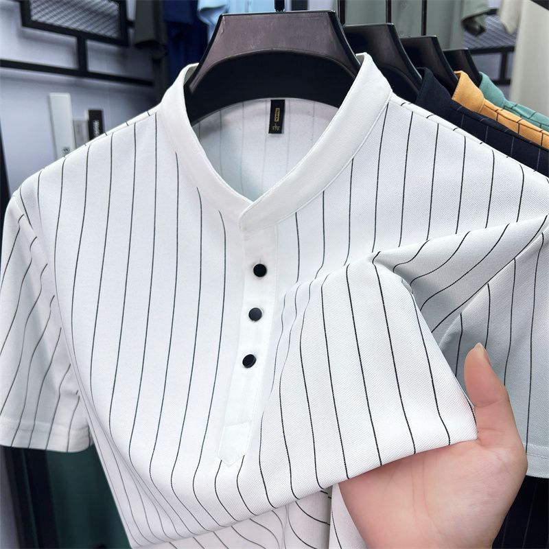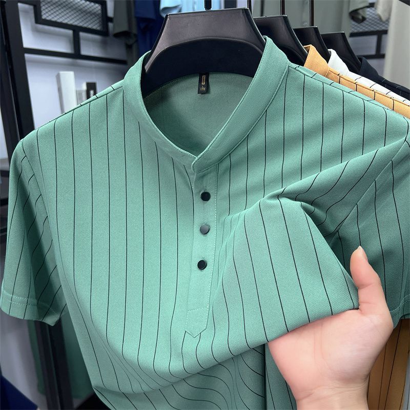 T-shirt homme en soie de mûrier manches courtes, col montant, rayé, coupe ajustée, style élégant