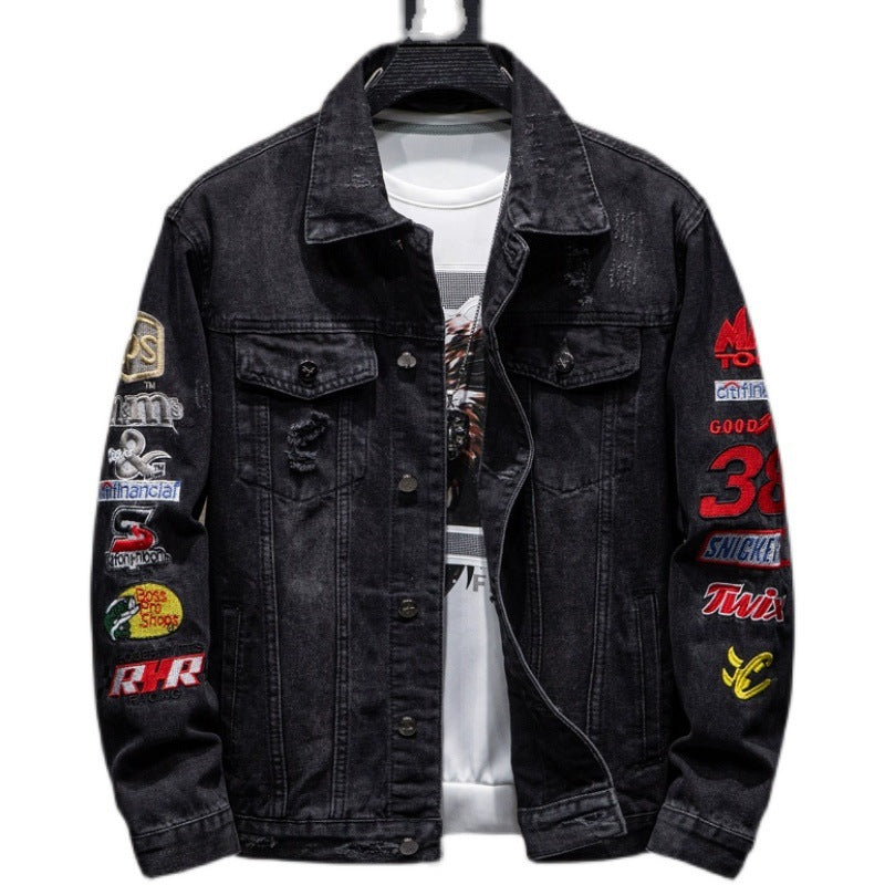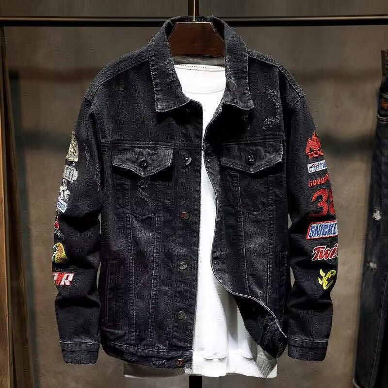 Veste en jean pour homme style urbain décontracté, coupe ample, détails brodés et badges, effet usé tendance, idéale pour un look jeune et stylé.